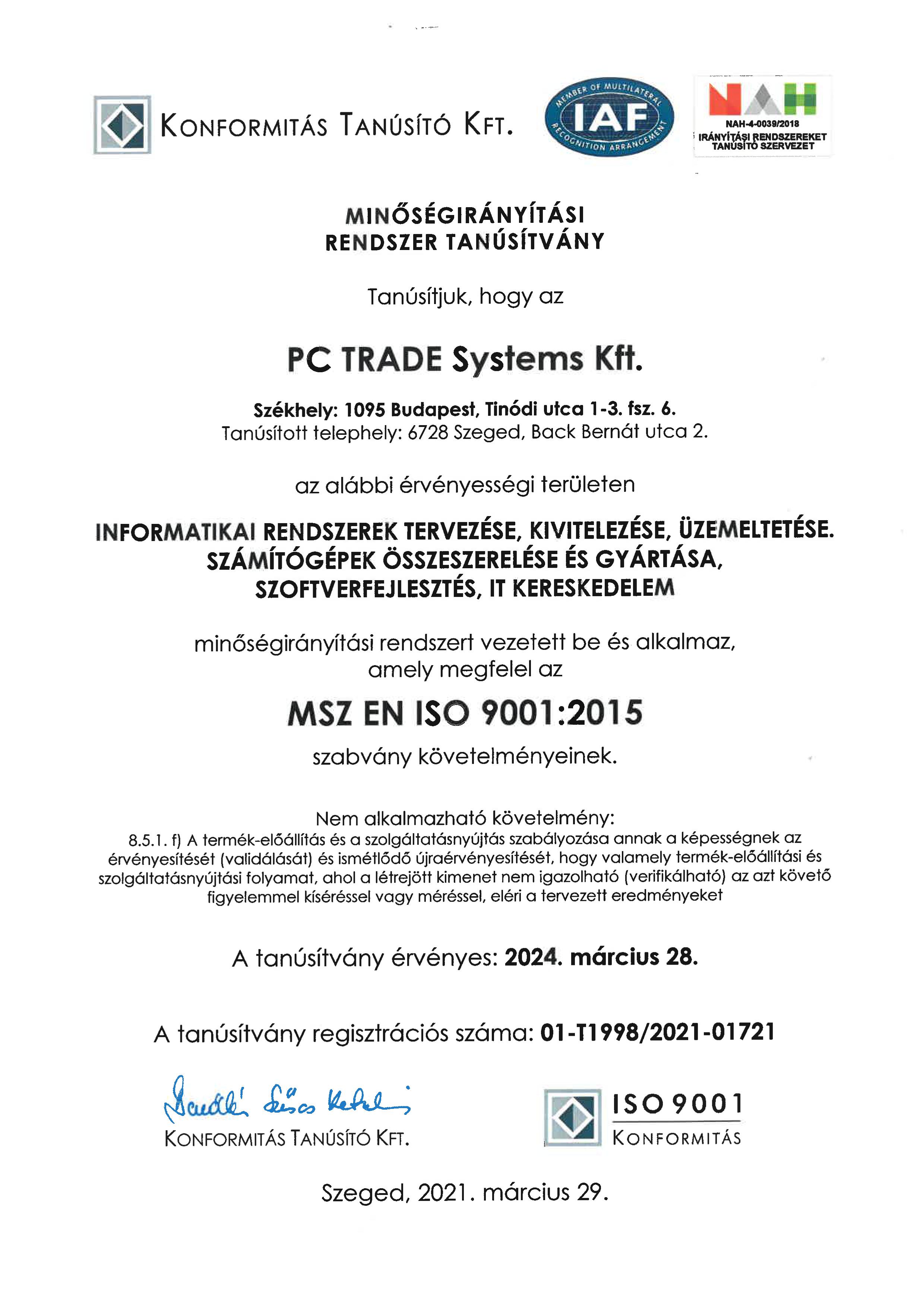 Cégünk a vállalati és az intézményi ügyfelek megbízható partnere kíván lenni az eseti és rendszeres hardver, szoftver szállítás illetve informatikai rendszerek tervezése és kivitelezése, valamint üzemeltetése területén. A gyártói és disztribútori kapcsolatok ápolása és fejlesztése, valamint a különféle minősítések megszerzése folyamatos stratégiai célunk. Mindezek által kívánjuk biztosítani meglevő és jövőbeli ügyfeleink részére, hogy nálunk az IT rendszerük a lehető legjobb kézben van. Kijelentjük, hogy cégünk minden munkatársa elkötelezett az ügyfelek érdekeinek és szükségleteinek felismerésére, látens igények keltésére, és azok szem előtt tartásával a legmegfelelőbb megoldások kiválasztására. A szervezeti folyamatok átláthatóságának növelése, és ezáltal a vevői elégedettség emelése érdekében bevezettük, működtetjük és folyamatosan fejlesztjük az MSZ EN ISO 9001:2015 szabvány szerinti minőségirányítási rendszerünket. A nemzetközi szabvánnyal összhangban, a vevőink teljes körű elégedettségének elérése érdekében meghatároztuk minőségirányítási célkitűzéseink fő szempontjait: